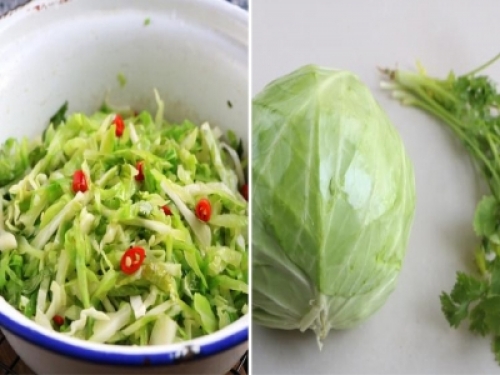 製作配料:高麗菜半顆香菜1顆鹽2勺香醋3勺香油半勺小米椒2個