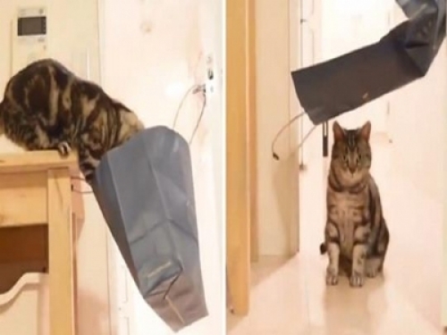 喵皇起飛又降落的瞬間,紙袋應聲破裂!