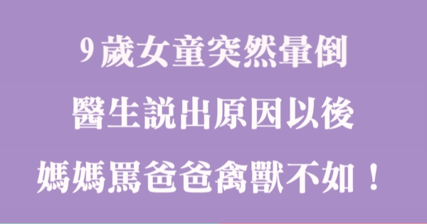哈摟哈摟各位讀者~~我是有錢人這麼想小編Choco!今天要來說說關於「9歲女童突然暈倒,醫生說出原因以後,媽媽罵爸爸禽獸不如!」,不知道大家有沒有興趣呢!一起來看看是怎麼樣的事吧!