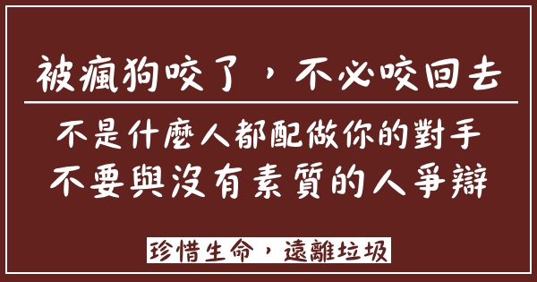 被瘋狗咬了,不必趴下咬回去!不是什麼人都配做你的對手,不要與沒有素質的人爭辯!