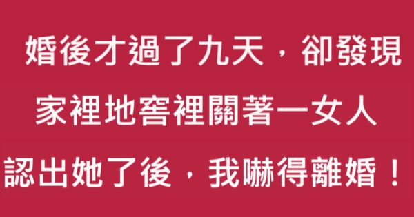 各位讀者安安阿~~我是有錢人這麼想小編Choco!今天要來說說關於「婚後才過了九天,卻發現家裡地窖裡關著一女人,認出她了以後,我嚇得趕緊離婚!」,不知道大家有沒有興趣呢!一起來看看吧!