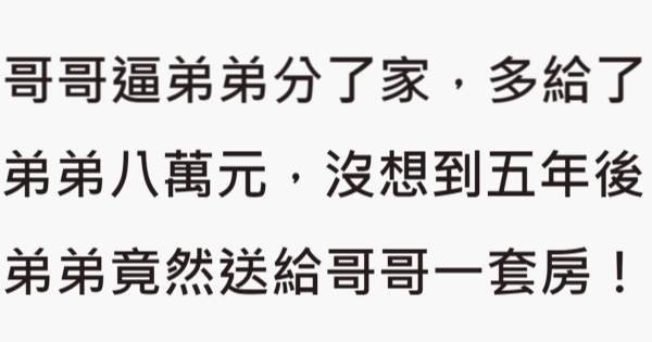 哈摟哈摟各位讀者~~我是有錢人這麼想小編Choco!今天要來說說關於「哥哥逼弟弟分了家,多給了弟弟八萬元,沒想到五年後,弟弟送給哥哥一套房!」,不知道大家有沒有興趣呢!一起來看看是怎麼樣的事吧!