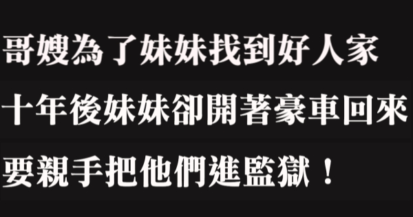 大家好,我是有錢人這麼想小編Choco!今天要來說說關於哥嫂為了妹妹找到好人家,十年後妹妹卻開著豪車回來,要親手把他們進監獄!的事!不知道大家對於這個有多了解呢?一起來看看吧!