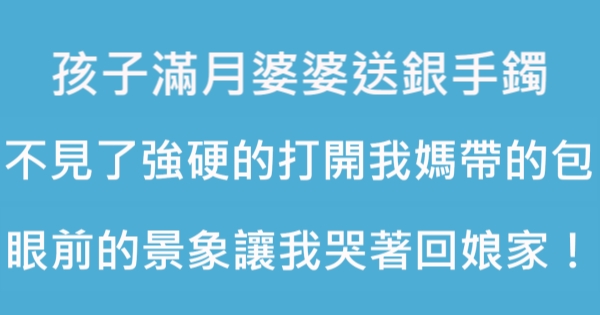大家好,我是有錢人這麼想小編Choco!今天要來說說關於孩子滿月婆婆送銀手鐲,不見了強硬的打開我媽帶的包,眼前的景象讓我哭著回娘家!的事!不知道大家對於這個有多了解呢?一起來看看吧!