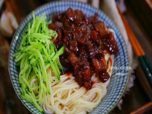 第九步:撈一碗面,盛一勺醬,再放上少許黃瓜絲,即可上桌開動了。
