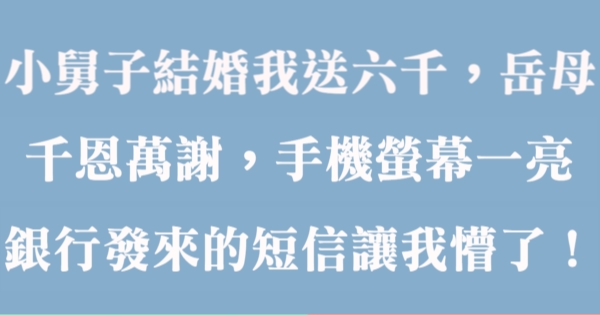大家好,我是 Choco 今天來跟你說說 小舅子結婚我送六千,岳母千恩萬謝,手機螢幕一亮,銀行發來的一封短信讓我懵了!吧!讓我們來看看!