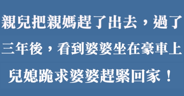 看完後是不是覺得Choco小編在有錢人這麼想分享的女人故事文章讓人深思呢?想看更多好文,或是喜歡有錢人這麼想的文章的話,可以按讚追蹤女生做自己最讚並分享這篇「親兒把親媽趕了出去,過了三年以後,看到婆婆坐在豪車上,兒媳跪求婆婆回家!」出去給大家一起看看!