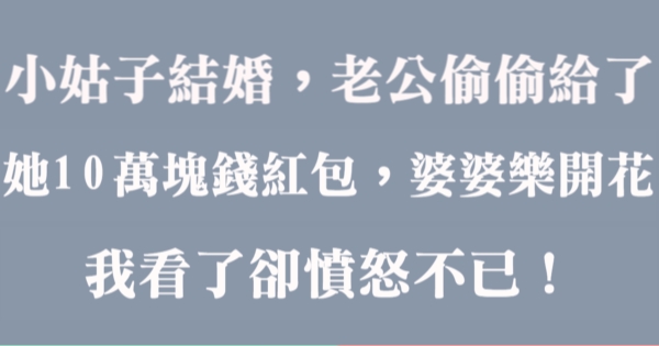 大家好,我是 Choco 今天來跟你說說 小姑子結婚,老公偷偷給了她10萬塊錢紅包,婆婆樂開花,我卻憤怒了!吧!讓我們來看看!