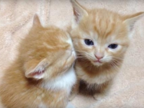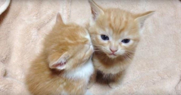 視頻中,有兩隻小喵看起來一臉睡眼惺忪,左邊的這隻已經先被睡魔擊倒,靠著右邊的這隻喵喵睡了起來……