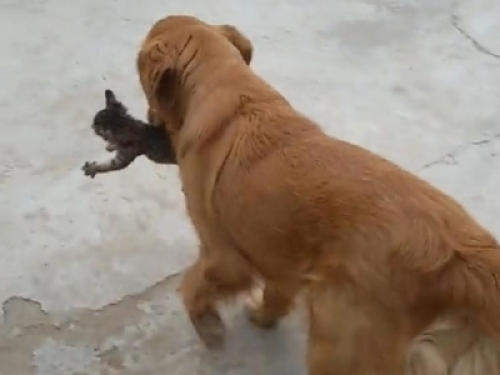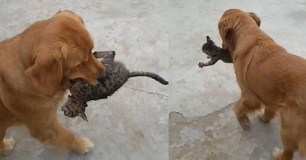 隻要小貓一跑開,金毛就會去給它叼回來,放在主人面前。這可讓主人省了不少心!