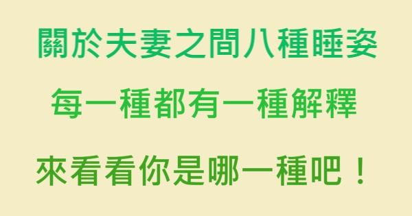 哈摟哈摟各位讀者~~我是有錢人這麼想小編Pineapple!今天要來說說關於「關於夫妻之間八種睡姿的解讀,每一種都有一種解釋,來看看你是哪一種吧!」,不知道大家有沒有興趣呢!一起來看看是怎麼樣的事吧!