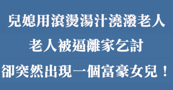 哈摟哈摟親愛的大家~~我是有錢人這麼想小編Pineapple!今天要來說說關「兒媳用滾燙湯汁澆潑老人,老人被逼離家乞討,途中卻突然出現一個富豪女兒!!」的事件!讓我們一起來看看吧!