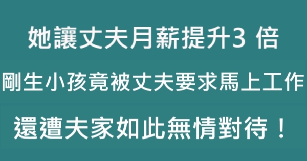 她讓丈夫月薪提升3倍,剛生完小孩竟被丈夫要求馬上去工作,還遭夫家如此無情對待!!太生氣了!!