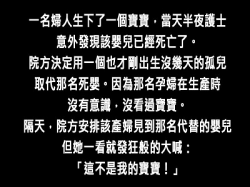 隔天,院方安排該產婦見到那名代替的嬰兒,但她一看就發狂般的大喊:「這不是我的寶寶!」