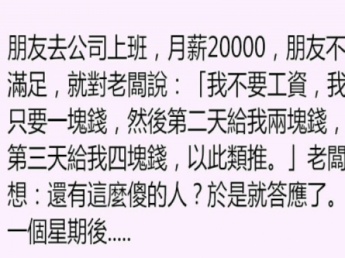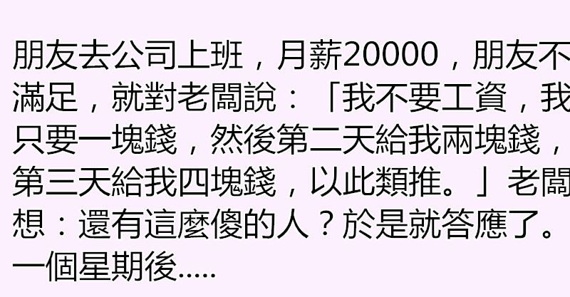 「我不要工資,我只要一塊錢,然後第二天給我兩塊錢,第三天給我四塊錢,以此類推。」