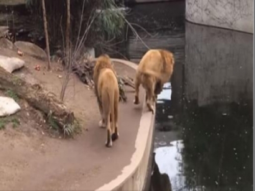 日前網路上就流傳了一段影片,在德國動物園內,有兩隻獅子正走在水泥圍籬邊悠哉地散著步。