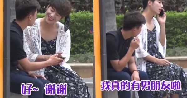 影片中這位疑似..不應該說就是「男扮女裝」的男子故意去跟坐在路邊上的男子借手機,說自己的手機沒電了要跟家裡面的人報平安,還故意用很嗲的聲音借喔~