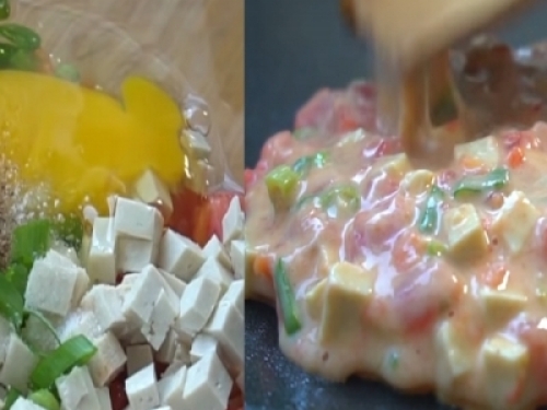 比例:兩個雞蛋、半杯麵粉、同等的豆腐、一杓鹽、一杓花椒粉、兩顆西紅柿