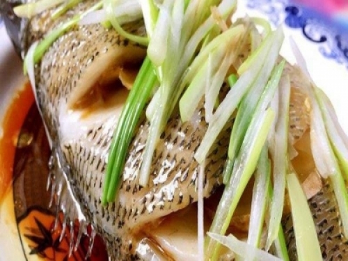 蒸好的魚取出後鋪上蔥絲、薑絲,淋上蒸魚豉油