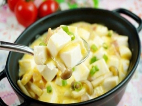 蟹黃豆腐是道口感醇香的家常菜,說是蟹黃,其實是以鹹鴨蛋的蛋黃為原料,熱油中炒散再入高湯,色澤鵝黃如蟹黃一般,固得名蟹黃豆腐。