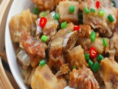 材料:排骨、香芋、鹽、醬油、雞精、料酒、生粉、蔥花