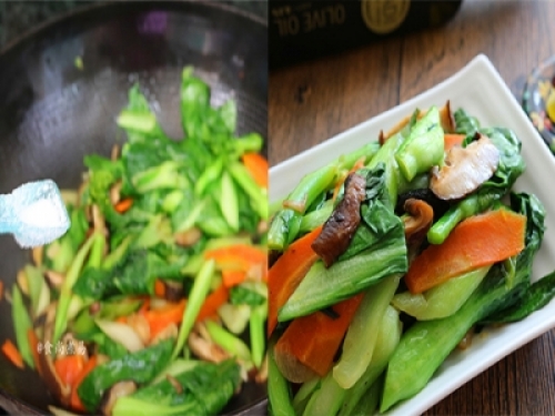 【食材】油菜300克、幹冬菇6個、 胡蘿蔔半個、蒜瓣2個、 橄欖油適量、鹽3克、蠔油1湯匙、清水少許