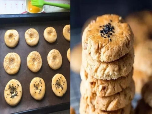 ⑨撒芝麻,放入烤盤,每個間隙要留夠,桃酥容易膨脹,以免粘連。