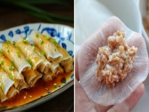 【水晶蘿蔔豬肉捲】 所需食材:白蘿蔔半個豬肉120克大蔥10克薑1片蠔油半湯匙鹽適量生抽2湯匙料酒1湯匙白胡椒粉少許糖少許玉米澱粉1湯匙雞蛋清半個水澱粉30克