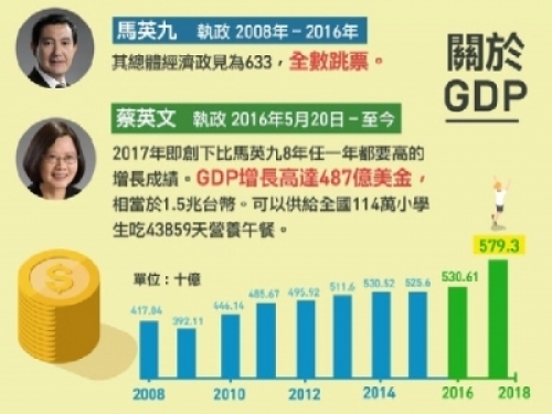 在股市上的表現,馬英九8年任內股市沒有一天破萬點,而蔡英文在任內2017年-2018年,股市上萬點17個月,這也與GDP增長高度正相關。