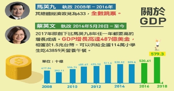 田昀凡在臉書分享自己製作的「你所不知道的蔡英文與民進黨政府-總體經濟篇」懶人包,在GDP(國內生產總值)的部分,馬英九633(經濟成長率6%、失業率3以下、人均所得3萬美元以上)全部跳票,蔡英文2017年即創下馬英九任內任何1年的都要高的增長成績,GDP增長487億美金,相當於新台幣1.5兆,可供全國114萬小學生43859天營養午餐。