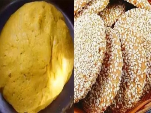 7、讓南瓜餅兩面粘滿炒熟的白芝麻粒,一個一個的擺好。