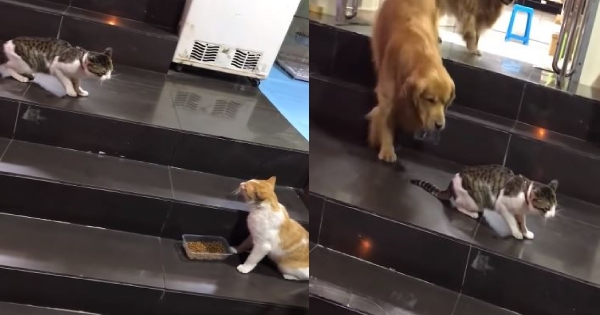 影片中,主人正好在路邊拍一隻小橘貓在吃飯的畫面,沒想到家中貓咪小寶殺出來,一副就要找小橘貓吵架的樣子,嘴巴一直碎碎念著「喵喵喵~」,媽媽立刻就叫騰騰帶小寶回家,這時候超乖巧的騰騰就走下階梯,用嘴巴咬著小寶的背袋,要把小寶帶走。