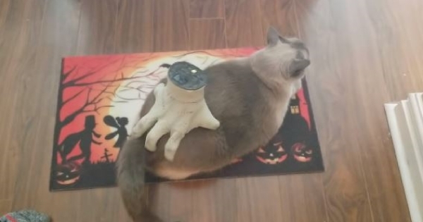 不過每年萬聖節結束之後,總會有些道具被收起來留著明年再用,不然就會在奇怪的時候發現新用途! 在國外,有名網友養了一隻貓咪叫做Kiko,她發現Kiko正舒服的趴在一個萬聖節地毯上,於是靈機一動決定拿出像是阿達一族裡面的小手,然後把這個機械手放在Kiko的屁股上。
