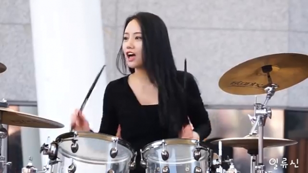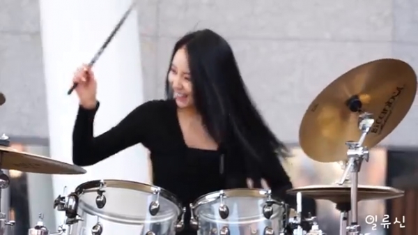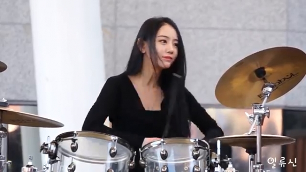 這位女鼓手以黑衣造型亮相,她雙手不停敲打著眼前的鼓,身體也同樣隨著音樂節奏甩動,打起鼓來全身上下散發出無人能夠抵擋的魅力。