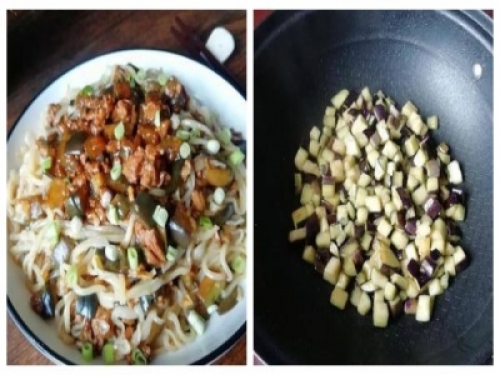 材料:鮮麵條200克、茄子2個、豬肉100克、油鹽適量、蔥1段、薑1片、大蒜2瓣、生抽1湯匙、老抽1/2湯匙、料酒1/2湯匙、水澱粉適量