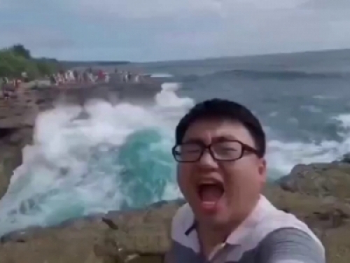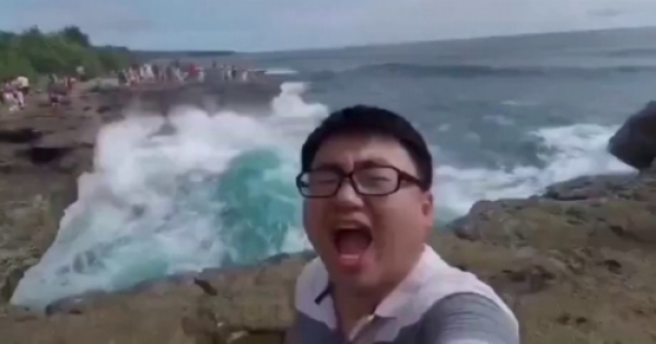 影片中男子開心的拿著相機在海邊陶醉的自拍,因為當時正逢颱風天所以海浪非常的大,男子自己為這畫面很美所以完全沒有注意到後面有個大浪,就在這時候....