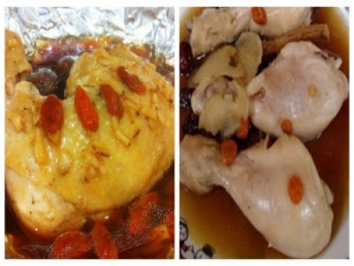 3. 將雞腿連同藥材湯汁一起盛入碟,用蒸爐蒸20-25分鐘,取出。