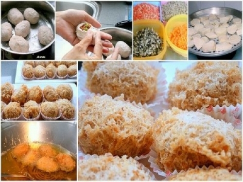 2。餡料部份。將瘦肉燙滾水備用。起鍋燒2大匙的食油,將蒜頭及大蔥炒香,加入瘦肉和紅蘿蔔炒勻,再加入冷凍青豆和調味料拌炒至熟。加入黍粉水勾芡,起鍋前灑上芝麻拌勻。