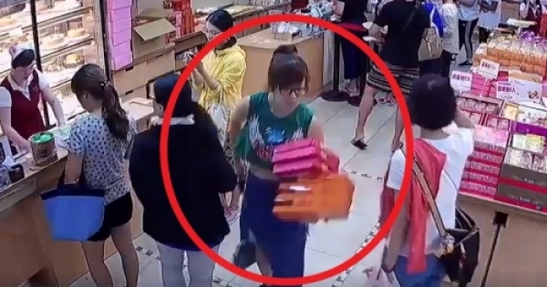 只見影片中這名身穿綠色衣服的女子看起來就像其他客人一樣在店裡面東挑西挑的,但是卻沒有像其他客人一樣走到櫃檯結帳,而是直接把餅抱出去然後就這樣走人??