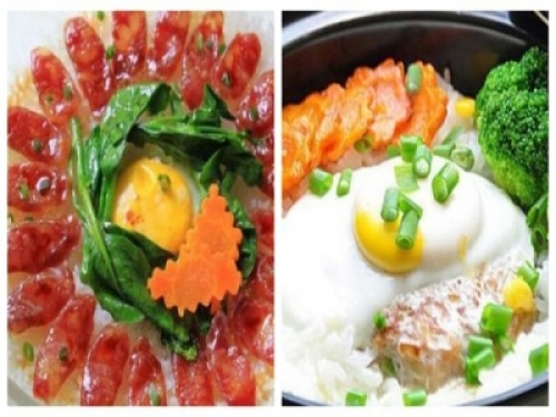 5將煎好的肉餅放入米飯中間。小火,在上面打一個雞蛋,蓋蓋子,燜至表面凝固即可。在上面放上西蘭花、胡蘿蔔花片、青豆和玉米粒點綴,吃的時候,淋上生抽攪拌即可。
