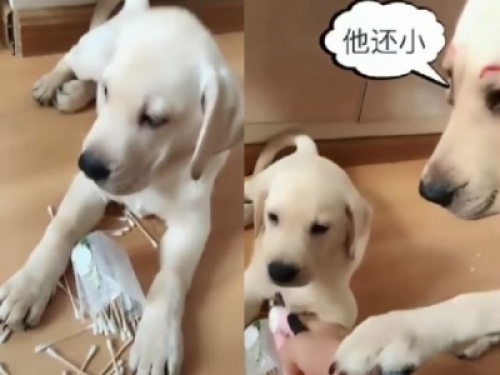 近日,網路上瘋傳一段影片,是一隻小狗狗把家中的棉花棒盒子給弄壞了,導致棉花棒撒滿地,讓主人看了氣到不行,一邊罵牠一邊準備要打牠,結果這時狗媽媽一個動作,讓所有網友看完都驚呼,「OMG,比我媽還偉大!」