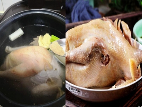 4 撈出雞,並把雞肚子裡的水控出去,雞放入電飯煲內膽,雞太大,我把雞爪子剁掉了,加入開水,水要多放些,中途就不要再加水了,放入生薑和大蔥去腥