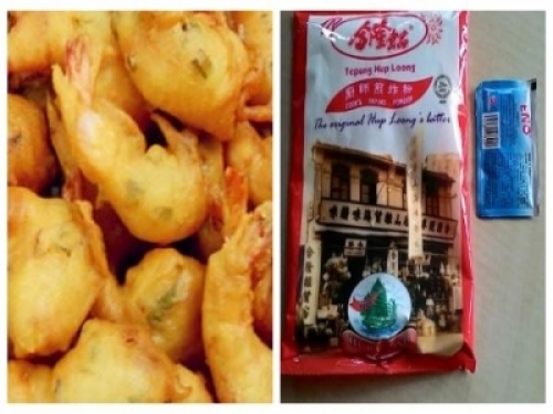 蝦餅食譜(可炸到七十多片)材料半kg麵粉一包合隆粉三分之一茶匙的Eno少許鹽少許胡椒粉