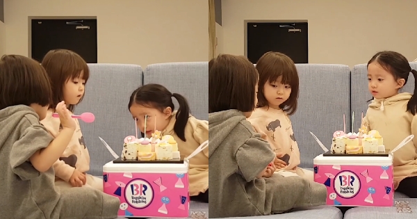 ▲舅舅故意擺出一顆美味的冰淇淋蛋糕,然後藉故上廁所離開現場,留下雙胞胎姊妹跟女兒小豆子