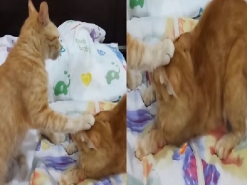 這對住在一起的歡喜冤家時常鬧出這個笑話!「我在拍影片。」飼主上傳一段38秒影片,只見公貓「星星」一掌抵住母貓「汪汪」頭頂,雙方就這樣在床上定格不動,要不是中途有微微甩耳,網友還以為「是我手機壞了」。