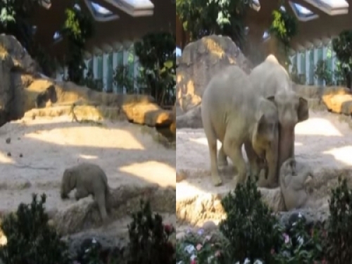 暖!小象跌倒四腳朝天嚎啕大哭! 家人立刻衝過去解救牠~