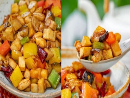 宮保杏鮑菇的做法,就是把雞丁換成杏鮑菇丁,下油鍋翻炒斷生。