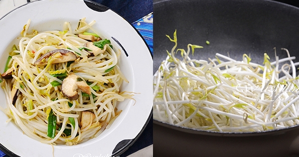 將新鮮香菇浸泡洗淨後直接切成片,香蔥切寸斷,姜也切成細絲,豆芽洗淨瀝乾備用