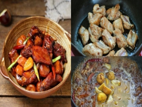 【板栗燒排骨】 所需食材:排骨500克板栗300克薑4小片蔥2根八角1個香葉1片紅乾椒4-5個花椒粒1小撮冰糖10克生抽2湯匙料酒2湯匙老抽1大匙清水適量食用油適量