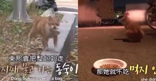 浪貓不知為什麼只願意叼走「袋裝飼料」偷偷跟蹤一看,眼淚差點掉下來!原來牠是拿去給...好感人!